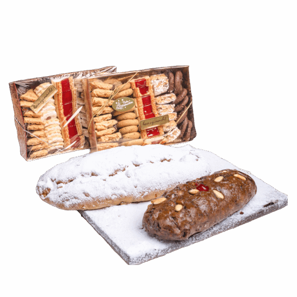 Zutaten: Weizenmehl, Butter, Magermilchpulver, Rosinen, Kristallzucker, Marzipan, Hühnervollei, Mandeln, Haselnüsse, Rum 38%, Hefe, Malz, Aranzini, Zitronat, Salz, Vanillezucker, Zitronensaft, Stollengewürz, Ingwer