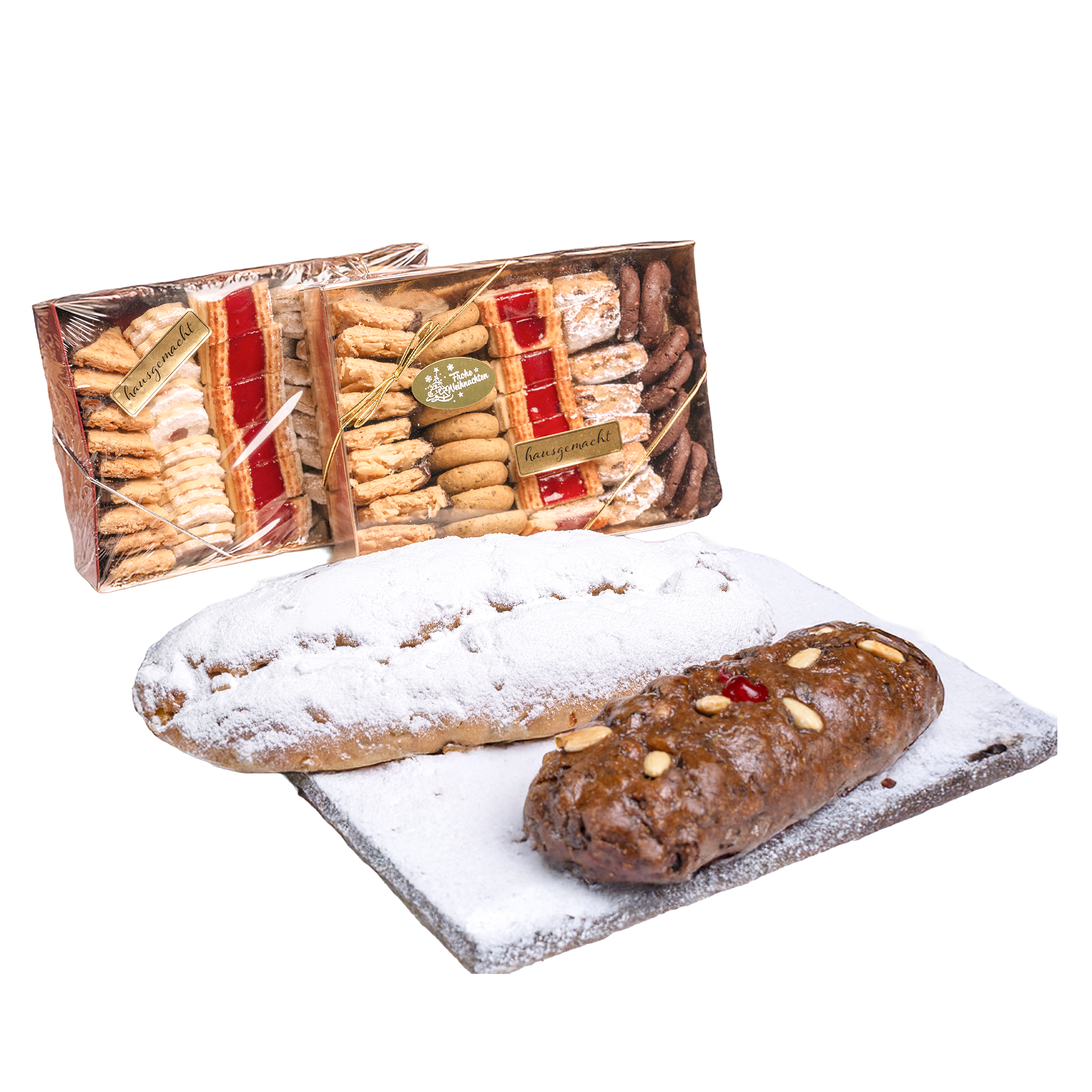 Stollenkonfekt: Weizenmehl, Butter, Staubzucker, Topfen, Aranzini, Cranberry , Rosinen, Rum, Salz, Backpulver, Lebkuchengewürz Eisenbahner: Weizenmehl, Butter, Rohmarzipan, Ribiselmarmelade (Zucker, rote Ribisel, Wasser, Pektin, Zitronensaft) Staubzucker, Honig, Hühnervollei, Salz, Vanilleschote Königsschnitten: Weizenmehl, Butter, Mandeln, kakaohaltige Fettglasur (Pflanzliches Fett, ganz gehärtet (40%) Zucker, Fettarmes Kakaopulver (23%), Sojalecithine), Zucker, Schlagobers, Honig, Marillenmarmelade (Zucker, Marillen, Zitronensäure, Pektin), Eiklar, Eidotter, Vanillezucker (Staubzucker, Vanilleschoten), unjodiertes Speisesalz. Schokotaler Butter, Schlagobers, Zucker, gelber Zucker, Eier, Mehl (Sojalecithin),Haselnüsse, Natron, Kakao, Cranberry Kürbiskernkipferl Butter, Mehl (Sojalecithin), Staubzucker, Kürbiskerne gemahlen, Eidotter, Vanille, Salz
